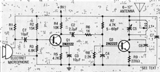 Encontramos este circuito en la revista Electronics Experimenter Handbook de 1993. L1 tiene 2 = 2 vueltas de 28 o 30 hilos en forma de 0,5 cm sin núcleo. El alcance alcanza algunas decenas de metros.