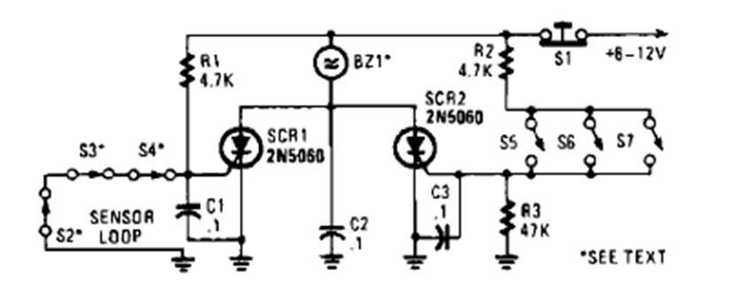 Esta alarma con sensores en serie y paralelo se encontró en la Enciclopedia de Circuitos Electrónicos de 1995. El número de sensores se puede modificar a voluntad.