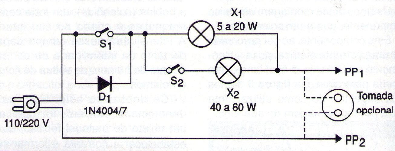 S1 y S2 son interruptores simples. El diodo D1 debe ser del tipo 1N4004 si la red es de 110 V y 1N4007 si la red es de 220 V.
