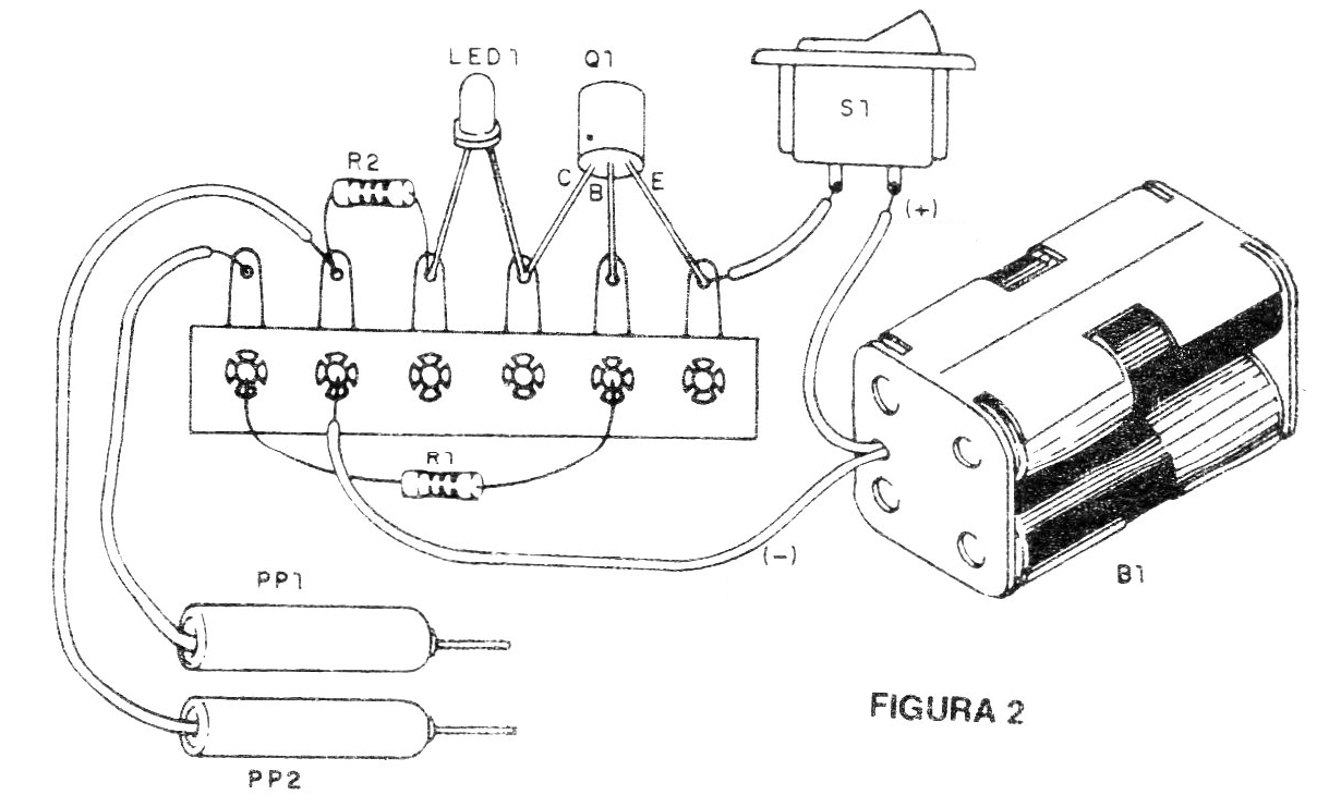 El conjunto se puede instalar en una pequeña caja de plástico e incluso el interruptor S1 puede ser eliminado, pues manteniendo las puntas de prueba PP1 y PP2 separadas, no hay consumo de energía. El LED debe quedar fuera de la caja, pudiendo ser de cualquier color. Las puntas de prueba pueden ser improvisadas con clavos grandes, si usted no desea usar un par comercial del tipo encontrado en multímetros.