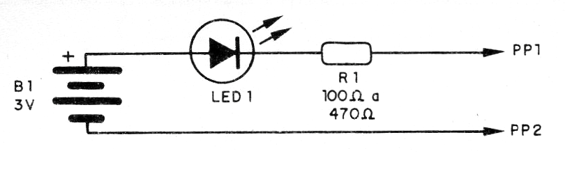 Las puntas de prueba pueden ser adquiridas en casas especializadas o improvisadas con clavos. La resistencia puede tener valores entre 100 ohmios y 470 ohmios. Observe en el montaje la posición del LED.