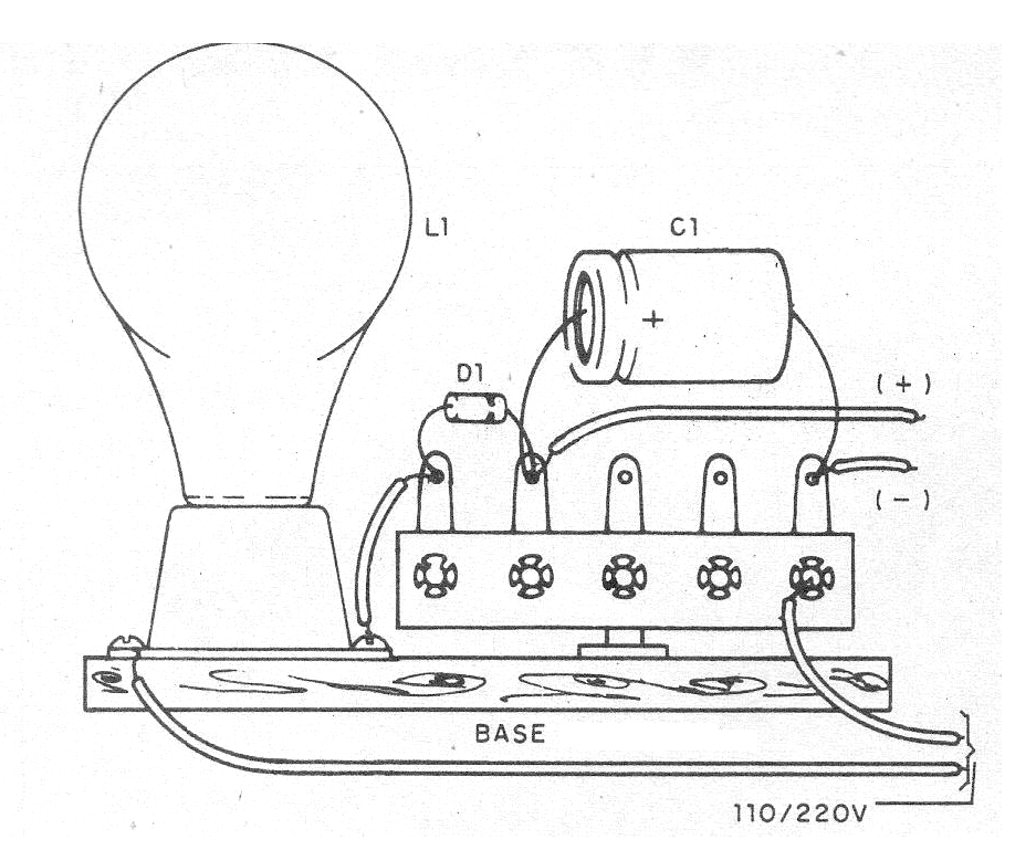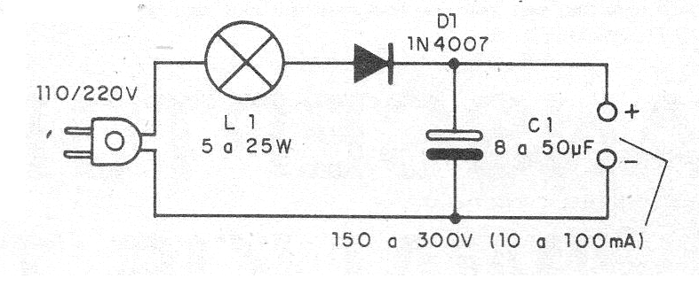 El circuito utiliza una lámpara incandescente común para limitar la corriente y un diodo para rectificar la salida. No hay regulación de tensión. La corriente de salida es del orden de algunas decenas de miliamperios. En la figura 1 tenemos el diagrama completo de la fuente.