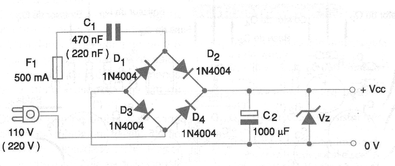 En la figura 1 tenemos entonces el circuito de una fuente sin transformador para corrientes hasta 20 mA.
