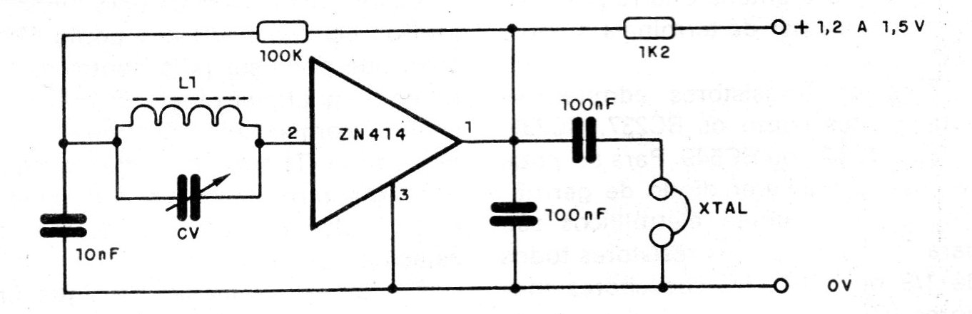 El ZN414 es un receptor completo que necesita muy pocos componentes externos para operar. Estos componentes básicamente son el circuito de sintonía formado por una bobina (L1) y una variable (CV), un resistor de polarización y un capacitor de desacoplamiento.