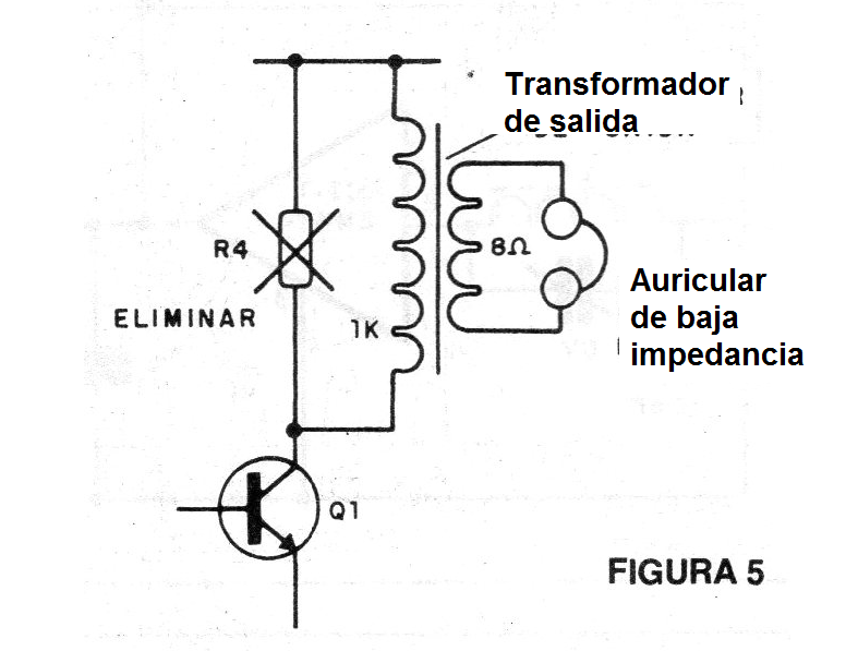 En consecuencia, con menor ganancia se puede utilizar un auricular de baja impedancia (tipo walkman) con un transformador de salida de al menos 1k de primario, conectado como muestra la figura 5, en lugar de resistencia de carga de colector del transistor.