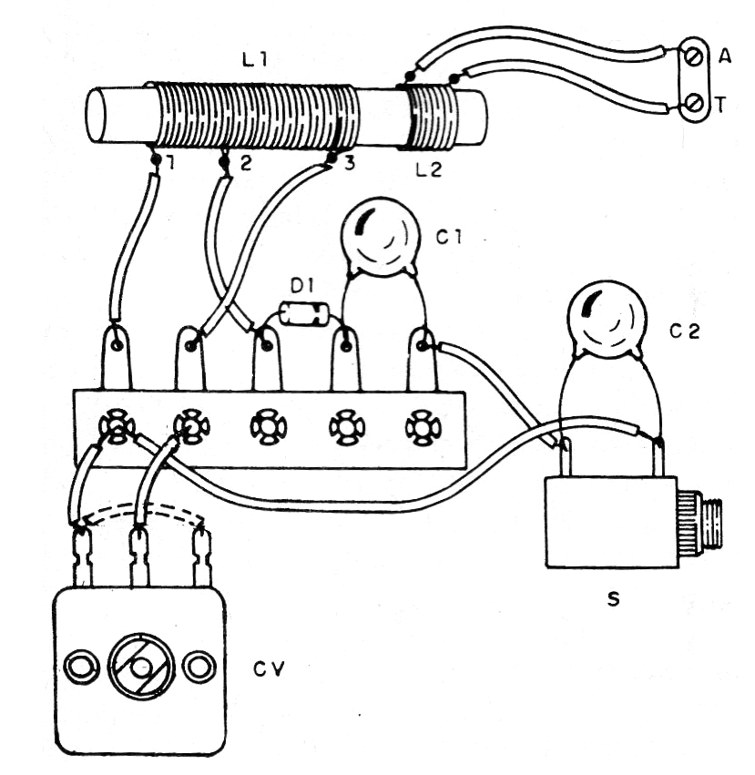 La bobina L1 está formada por 40 + 40 espiras de hilo 28 en un bastón de ferrita de 15 a 30 cm de longitud y aproximadamente 1 cm de diámetro. L2 consiste en 10 a 20 vueltas del mismo hilo al lado de L1. El condensador variable se puede obtener de cualquier radio AM antiguo.