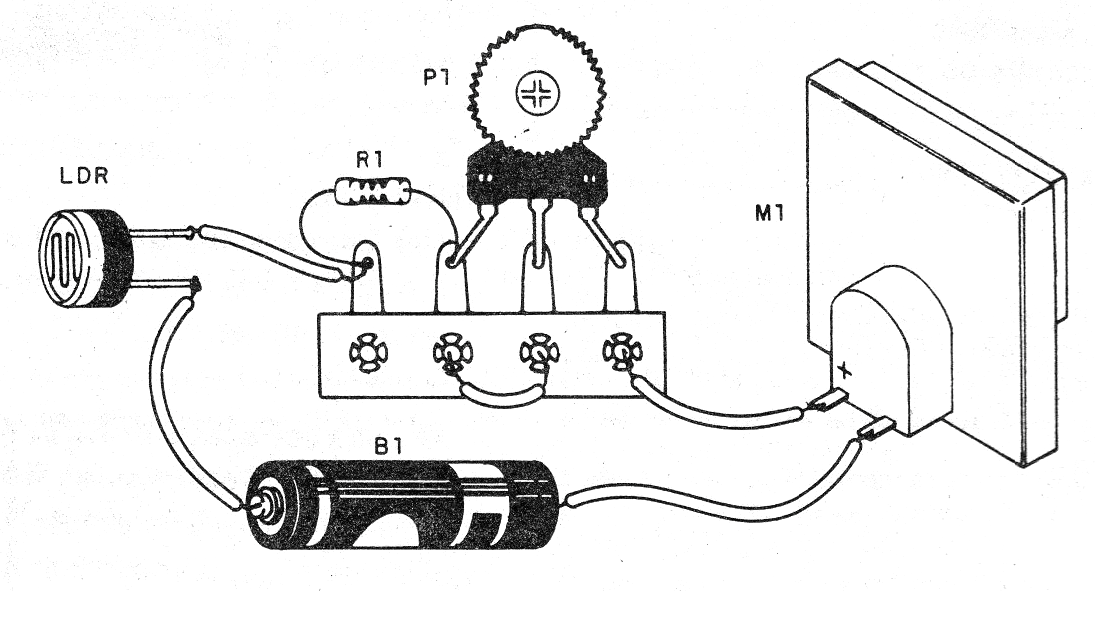 Observe la polaridad del instrumento M, para que la aguja no tienda hacia el lado contrario de la escala cuando se encienda el LDR. Si esto ocurre, basta con invertir las conexiones.