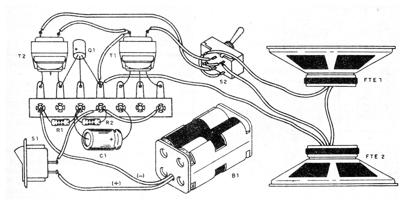 Es un montaje ultra simple que usted puede hacer con componentes de chatarra. Se trata de un intercomunicador experimental simple. Con la tecla S2 en una posición usted habla en un altavoz y el otro reproduce. Con S2 en la otra posición, invierte las funciones.