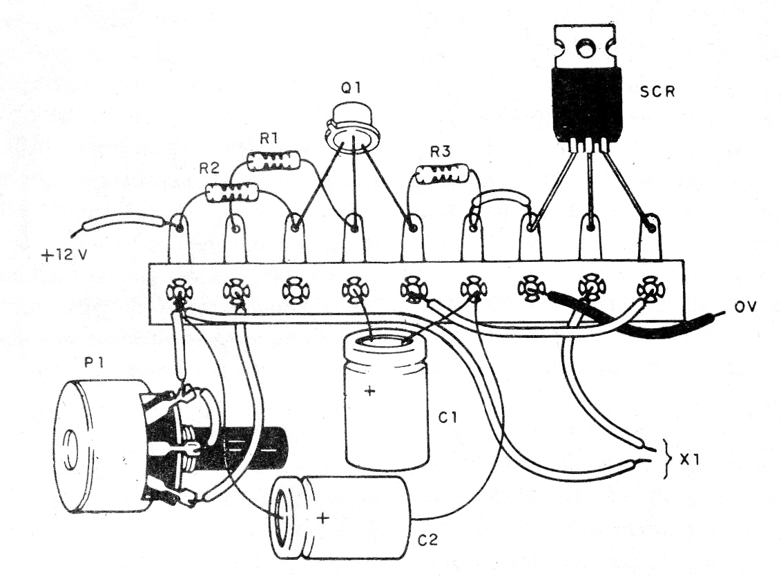 En la figura 1 tenemos el diagrama completo del aparato que tiene como base un transistor unijuntura y un SCR. P1 hace el ajuste del tiempo.