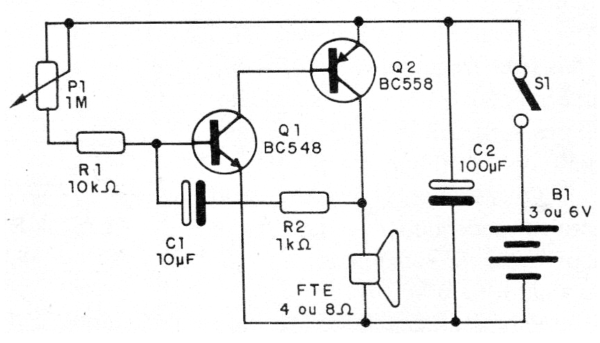 El circuito puede ser alimentado con tensiones de 3 a 6 V en la versión original y cambiando Q2 por un BD136 podemos alimentar con tensiones hasta 12 V obteniendo mayor potencia.