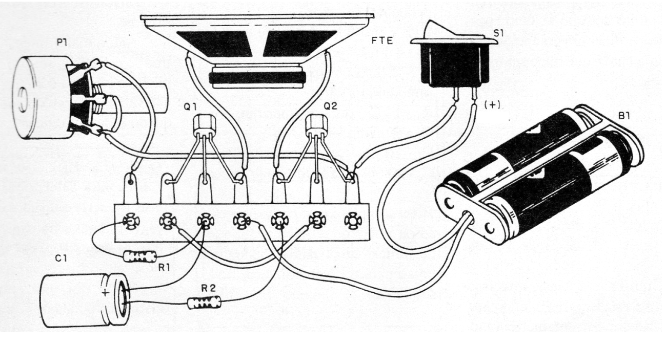 Este circuito consiste en una configuración bastante conocida de oscilador con transistores complementarios, explotadas otras veces en este sitio. El diferencial en este caso, es que mostramos el montaje en una matriz de contactos.