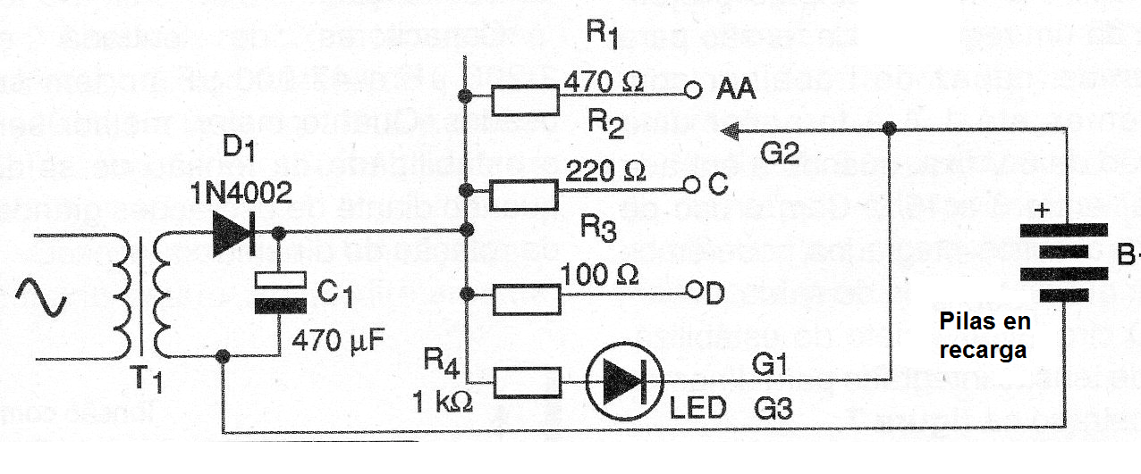 El circuito permite la recarga simultánea de 1 a 4 pilas del tipo AA, C y D e incluso baterías de 9 V. La polaridad de la conexión de las pilas en rejuvenecimiento debe ser observada.