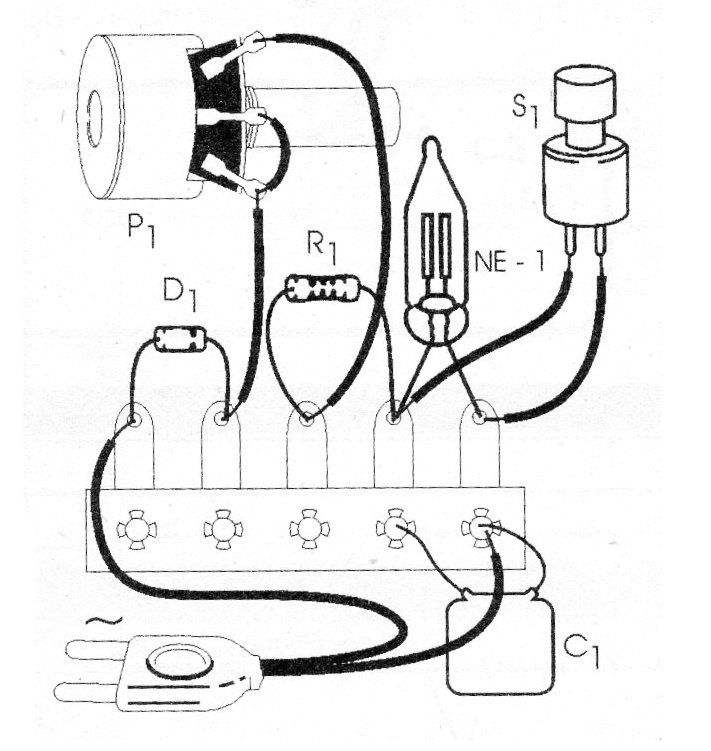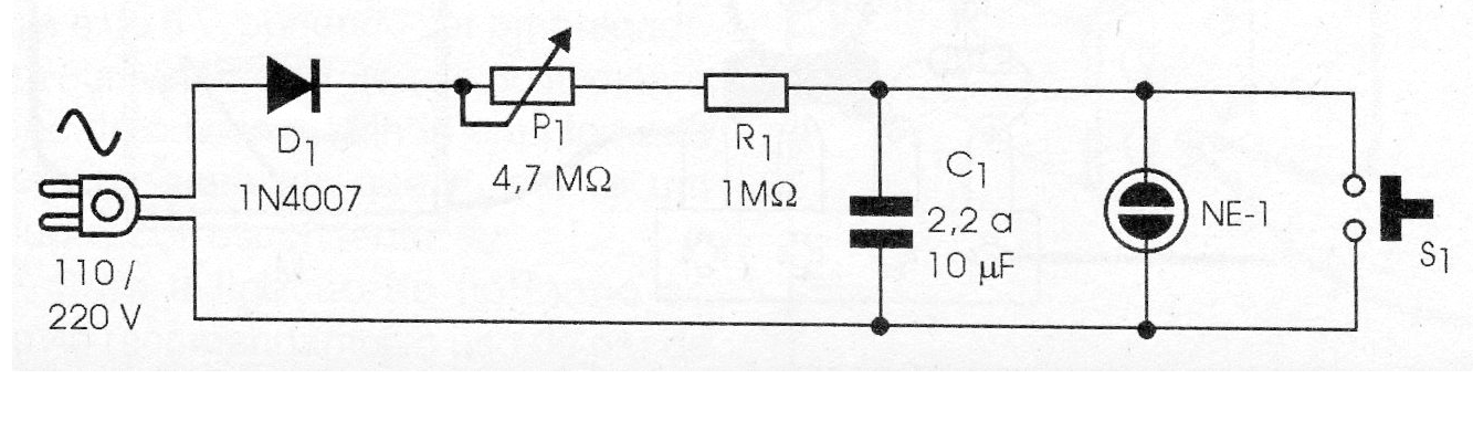 El capacitor C1 debe tener una tensión de trabajo de al menos 100 V (en cualquier red) y debe ser del tipo de poliéster con valores entre 2,2 y 10 uF. Los valores mayores conduce a la posibilidad de obtener temporizaciones mayores. El potenciómetro P1 es lineal de 4,7 M ohmios o 10 M ohmios.