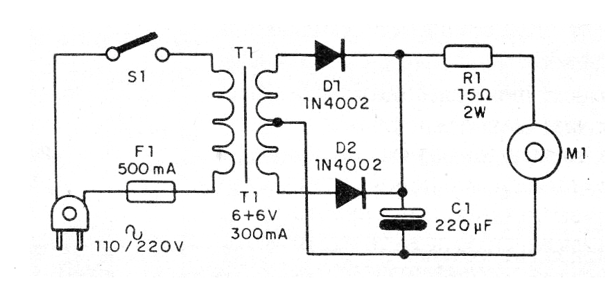 El transformador debe tener bobinado primario de acuerdo con la red local y secundaria de 6 + 6 V con al menos 300 mA de corriente, más si el motor es grande. El resistor R1 es de hilo y debe funcionar levemente calentado. No lo extrañe.