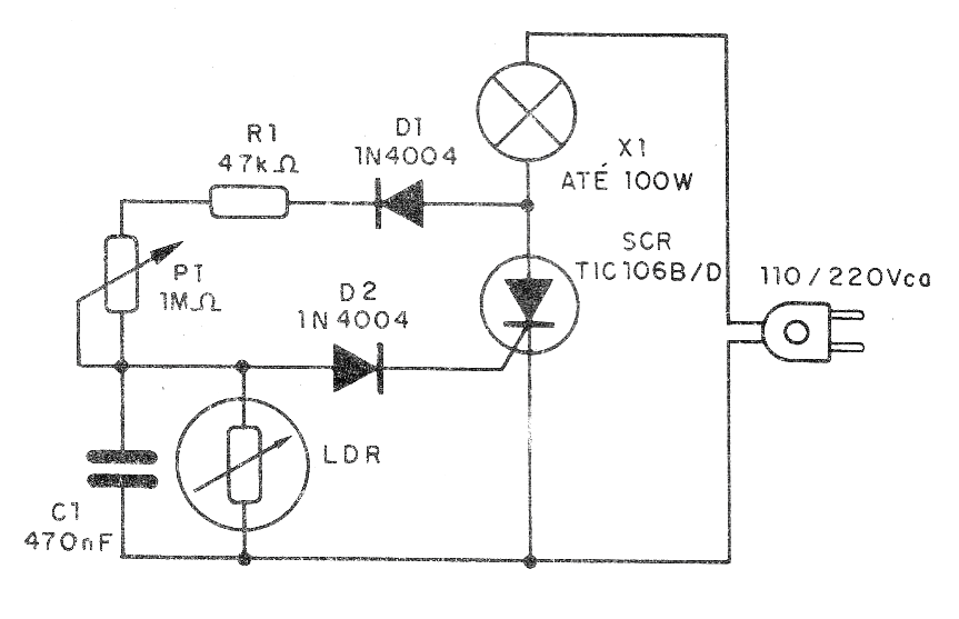 El SCR debe tener sufijo B si la red es de 110 V y sufijo D si la red es de 220 V. El capacitor C1 debe tener una tensión de trabajo de 250 V o más y el LDR puede ser de cualquier tipo o tamaño.