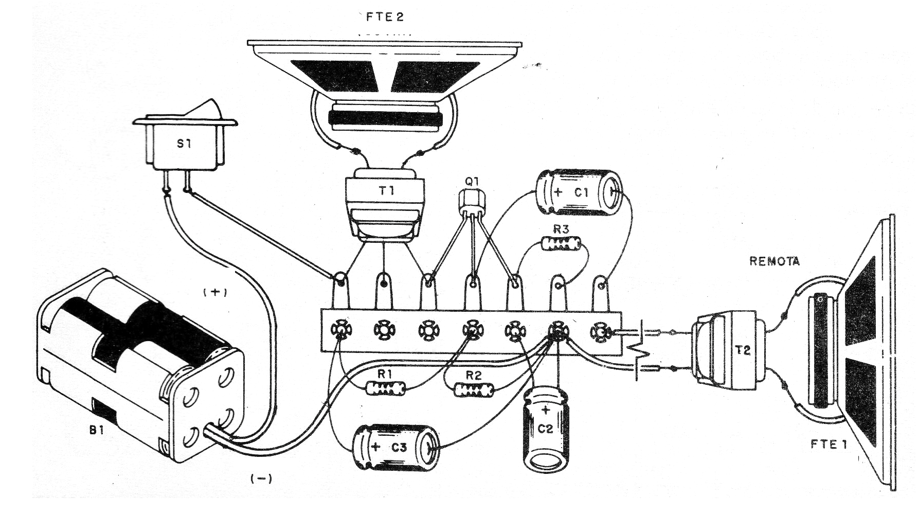 Con sólo un transistor (PNP o NPN) usted puede hacer un teléfono de juguete con buen rendimiento gracias a la amplificación del sonido. El sistema es alimentado por pilas y el cable entre las estaciones puede tener hasta más de 50 metros de longitud.