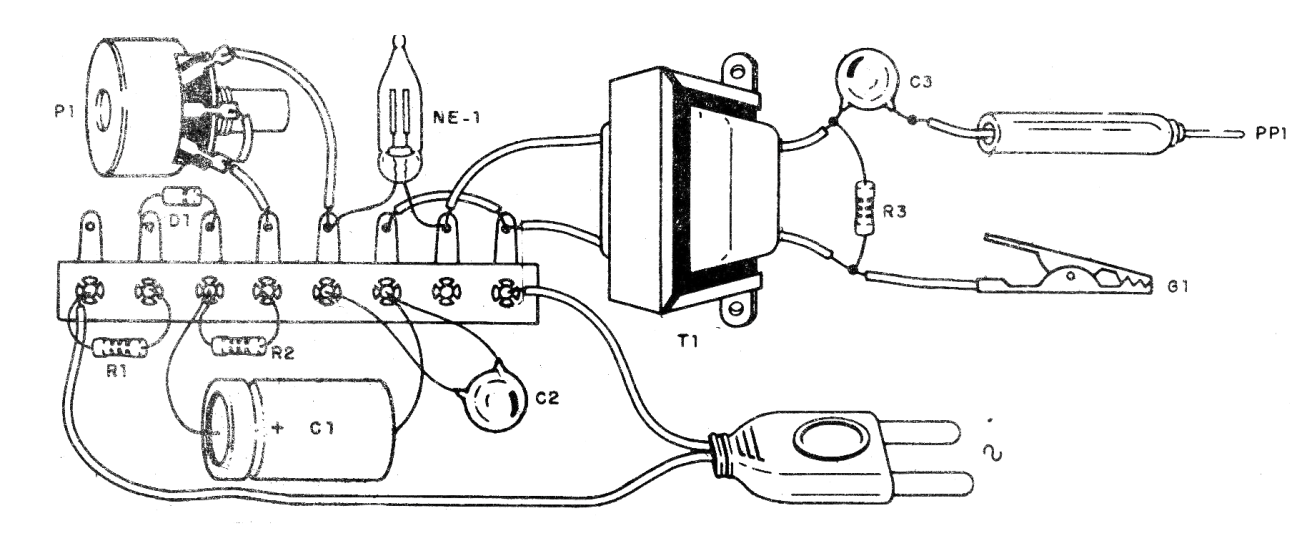 Un oscilador de relajación con lámpara de neón es la base de este circuito que se puede utilizar como instrumento de banco. Alimentado por la red de 110 V o 220 V tiene un consumo extremadamente bajo. Con él podemos generar señales de audio para pruebas de equipos diversos. La señal es de pequeña amplitud que puede ser usada con equipos transistorizados. El circuito genera señales en el rango de 500 a 10 000 Hz.