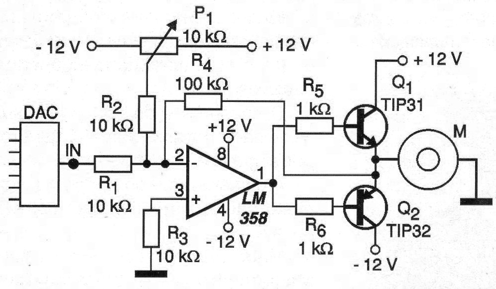 En este circuito, las señales analógicas (tensión) obtenidas en la salida del convertidor D / A van a determinar la conducción de los transistores y con ello tanto la potencia aplicada al motor como su sentido de rotación.