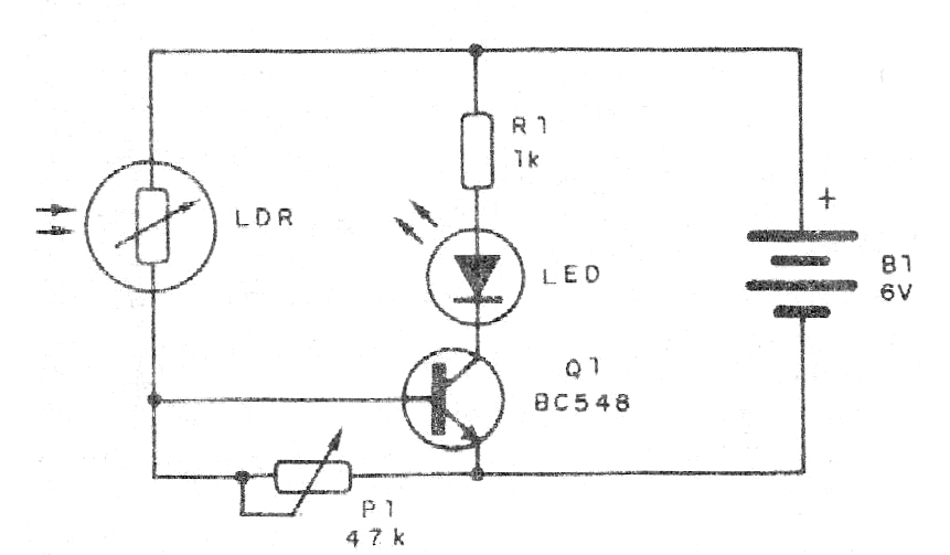 Este circuito sirve para demostrar el principio de funcionamiento de los LDR, accionando un LED con la luz que incide en este componente. Podemos usarlo en demostraciones o clases de tecnología o para la remoción remota de luz, conectando el LDR al circuito por un largo hilo.
