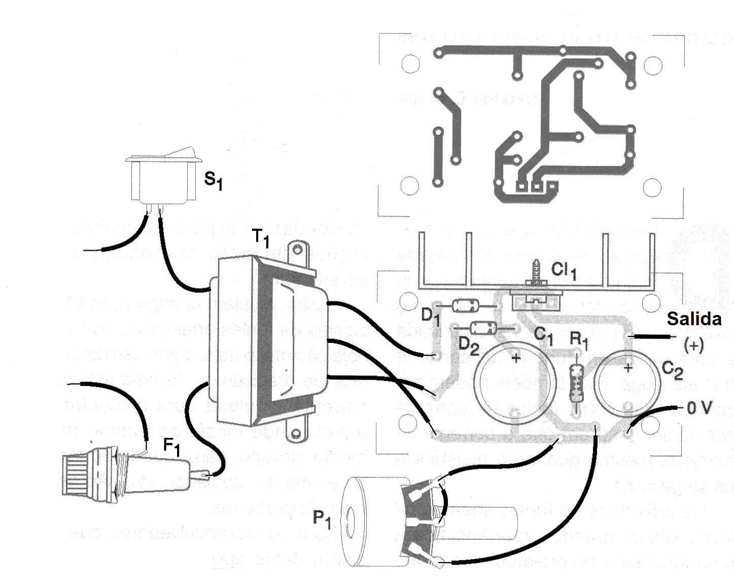 Placa de circuito impreso, radiador de calor para el transistor, cable de alimentación, hilos, soldadura, etc.