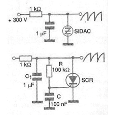 La misma configuración puede ser implementada con dispositivos más modernos como diacs y sidacs e incluso SCRs, como muestra la figura 2.