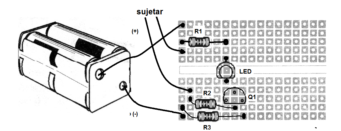 En nuestro experimento, usaremos dos hilos que sosteniendo entre los dedos, permiten pasar una corriente muy baja a la base del transistor.