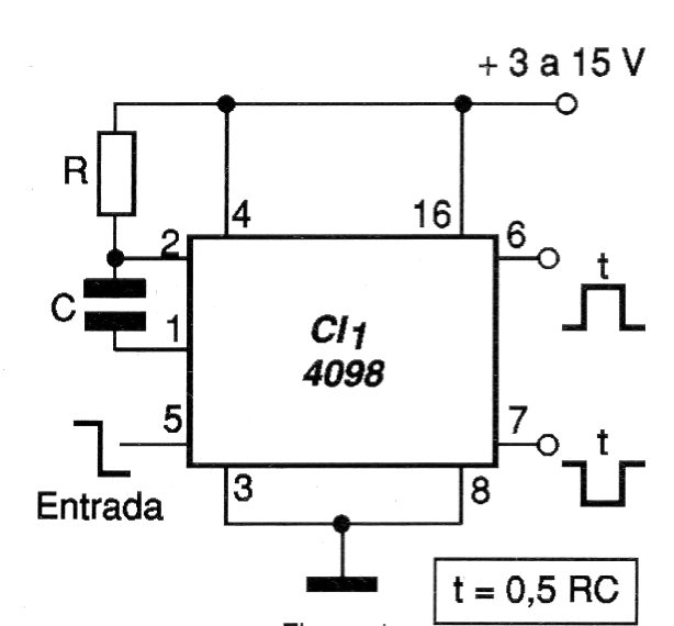 El circuito de la figura 1 utiliza un 4098 CMOS en la configuración monoestable proporcionando una salida normal y una salida complementaria. El tiempo en que la salida permanece en el estado activo depende de R y de C, como fórmula junto al diagrama.