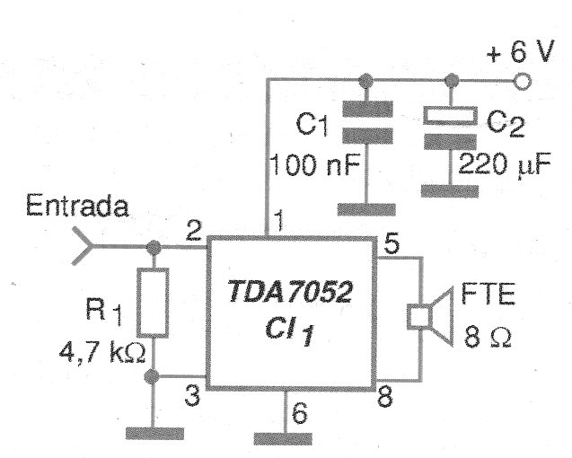Se basa en el circuito TDA 7051 que proporciona cerca de 1 W con alimentación de 6 V y sólo necesita una resistencia y dos capacitores externos. Para el acoplamiento al circuito externo es interesante utilizar un capacitor de 100 nF a 10 uF dependiendo de la fuente de señal.