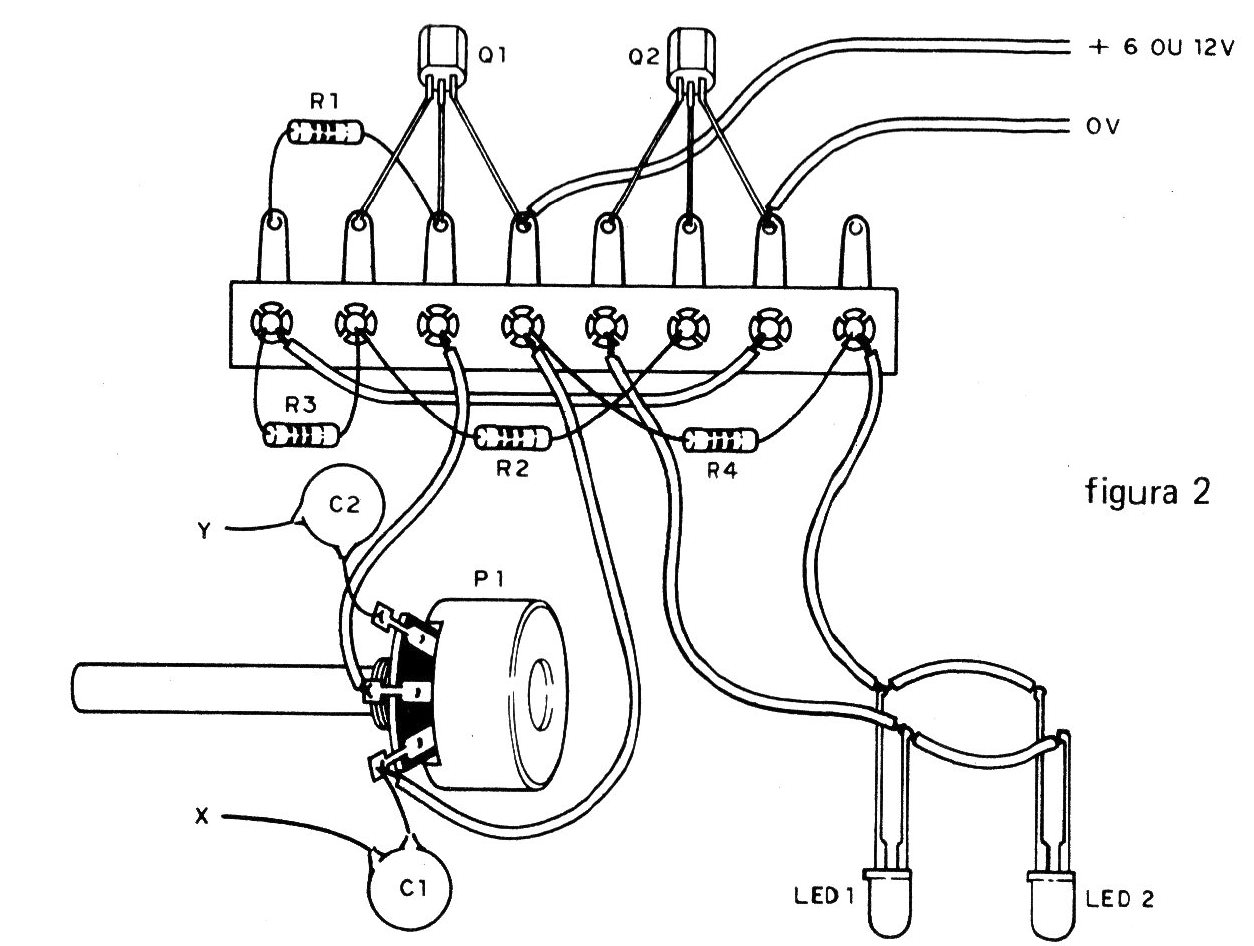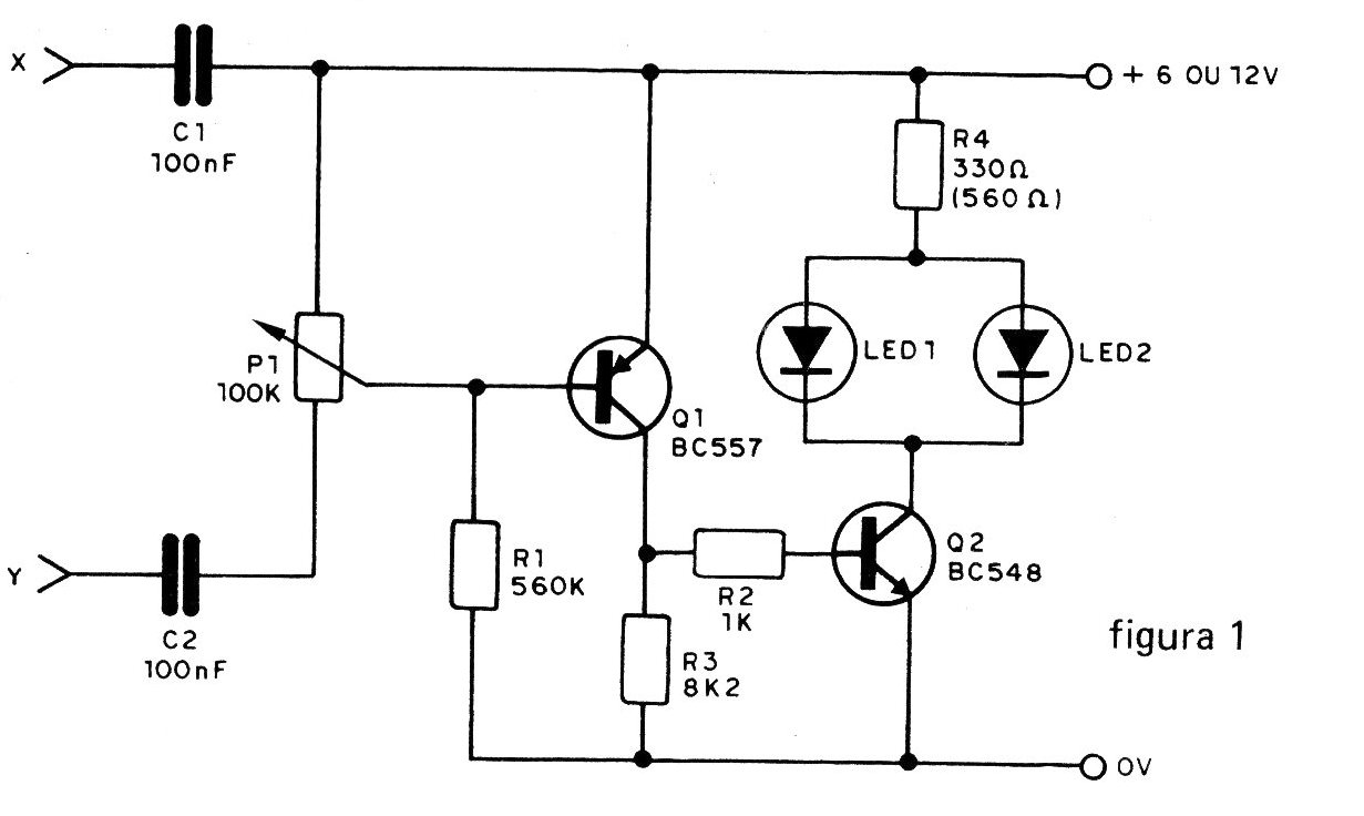 La señal del potenciómetro pasa a dos transistores complementarios (un BC557 y un BC547), donde sufre gran amplificación hasta el punto de poder excitar fácilmente dos LED.