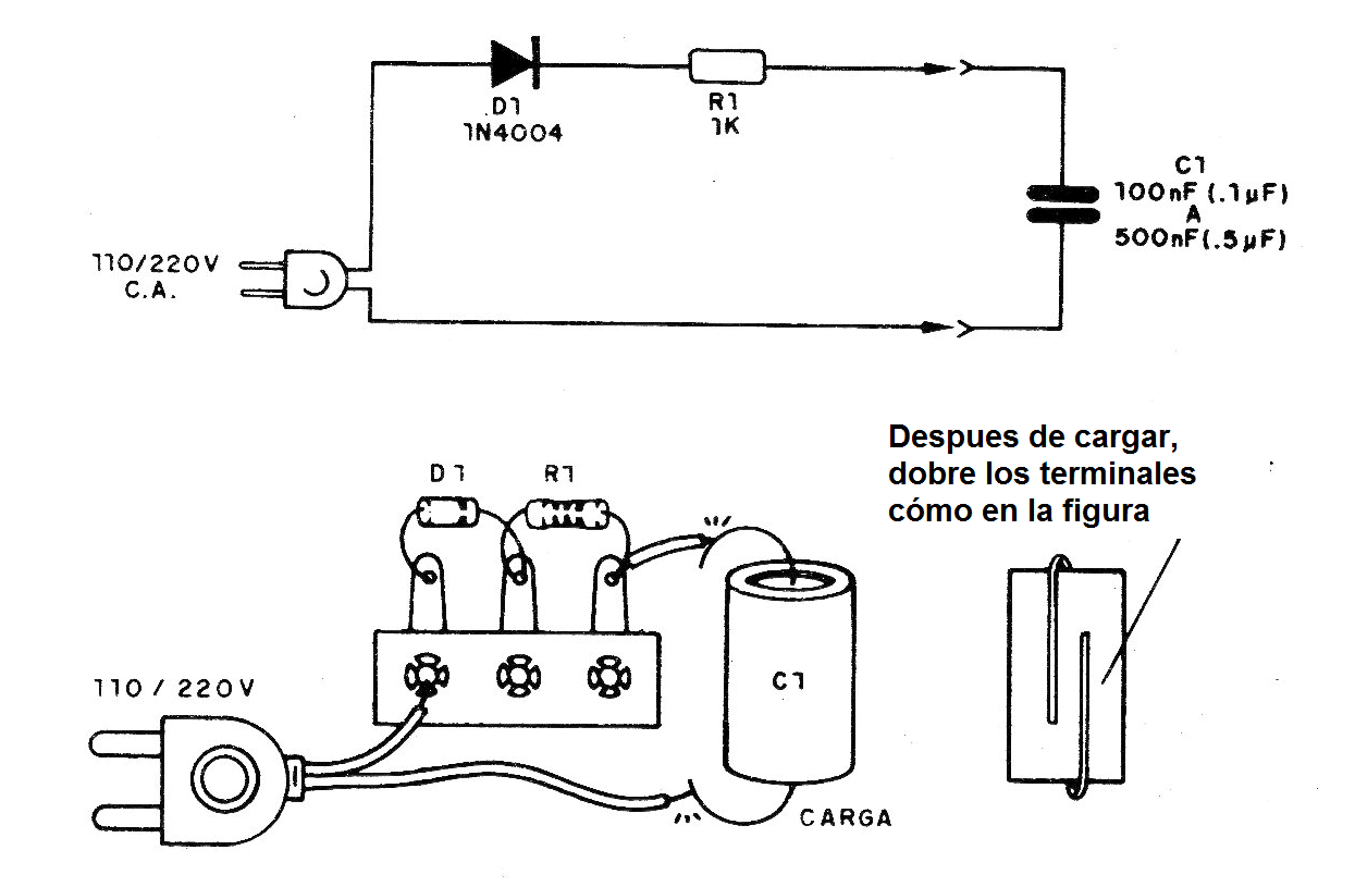 El circuito cargador consiste en sólo un diodo y una resistencia, donde el capacitor se conecta durante unos segundos para la carga.