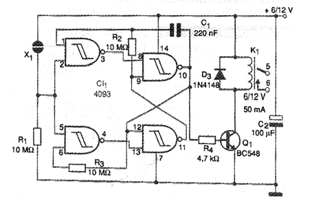 A diferencia del circuito mostrado en la figura, en relación al CIR8144r, es que utiliza un sensor sólo para encender y apagar un relé. Con un toque el relé se activa y con un nuevo toque el relé se desactiva. En este circuito un flip-flop un poco diferente en el que la red formada por R2, R3 y C1 determina una acción biestable con sólo un sensor. El relé debe tener bobina de acuerdo con la tensión de alimentación y corriente máxima de 50 mA. El resistor R1 puede tener su valor aumentado para más sensibilidad y el sensor es igual al del proyecto anterior. En la alimentación se deben utilizar pilas o baterías. Si se utiliza la fuente, debe aislarse de la red de energía.