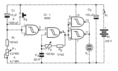 El circuito mostrado en la figura acciona un relé que puede tener como carga aparatos de mayor potencia, incluso conectados a la red de energía. Su principio de funcionamiento es simple de entender. Cuando la alimentación se establece, el capacitor C1 se carga lentamente a través de R1 y P1 de modo que la tensión inicialmente alta en la entrada del puerto inversor va cayendo lentamente.