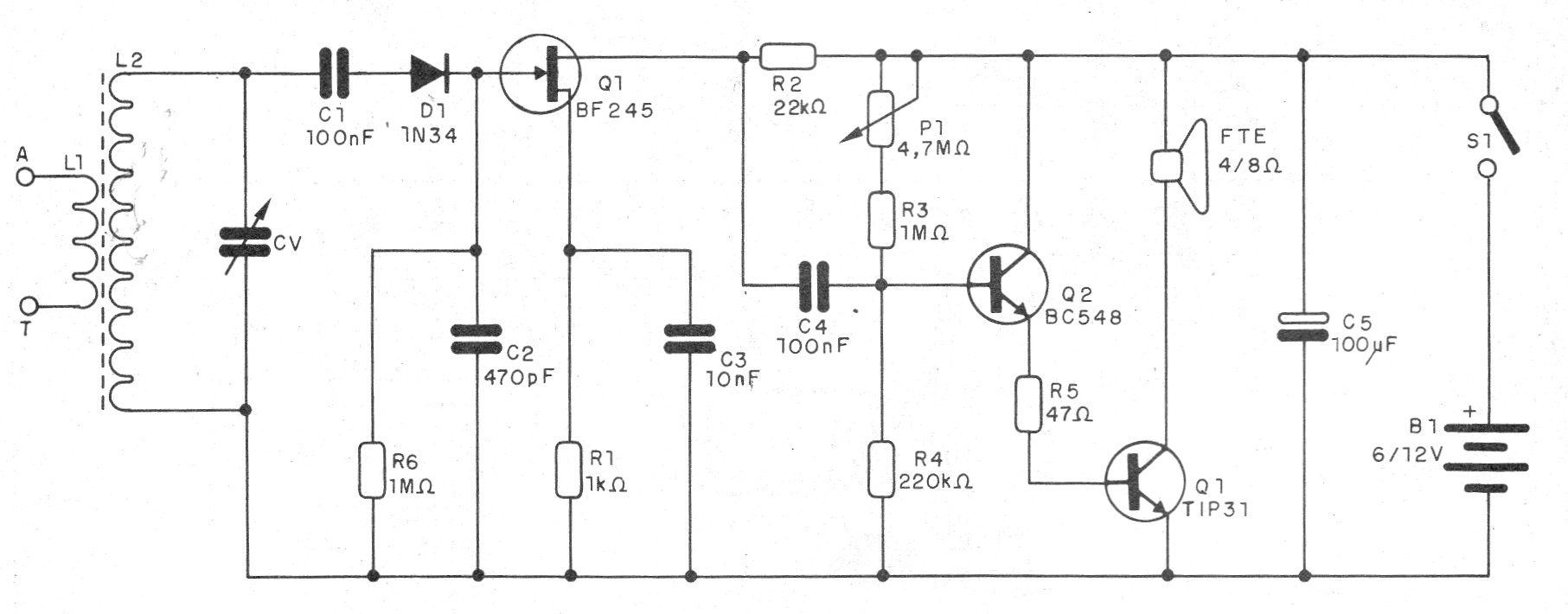 En la figura 1 tenemos el diagrama completo del receptor de dos transistores para el rango de ondas medias.