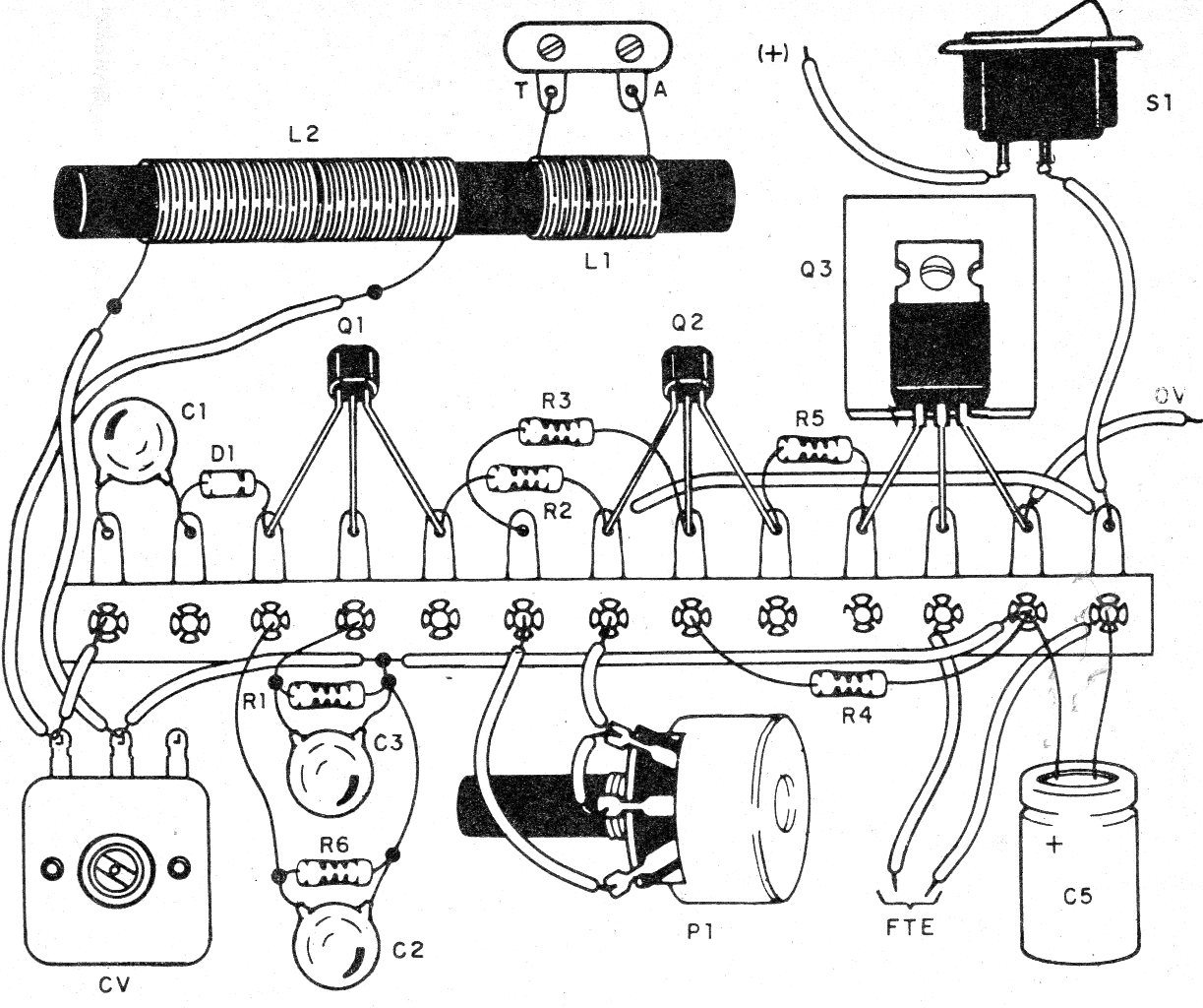 Para probar, conecta una antena (pedazo de cable de 2 a 5 metros) y la conexión a tierra, ajustando CV y P1 para la mejor recepción.