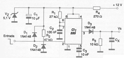 El circuito puede operar con tensiones en el rango de 5 a 18 V, pero los valores indicados, principalmente del zener son para una tensión de alimentación de 12 V. El capacitor C2 también debe tener su valor experimentado de acuerdo con el rango de frecuencias que debe medirse.