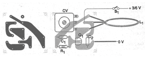 La bobina está formada por 25 + 25 espiras de hilo 28 AWG en una forma de plástico de 30 a 50 cm de diámetro (cuanto mayor, más sensible) El circuito puede ser alimentado por dos o 4 pilas pequeñas y. tiene su placa de circuito impreso sugerida en la figura 2.