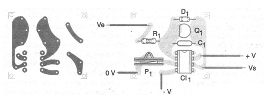 En la figura 2 tenemos una sugerencia de placa de circuito impreso para el montaje del amplificador logarítmico. Observamos que el diseño depende mucho del tipo de señal que se va a trabajar.