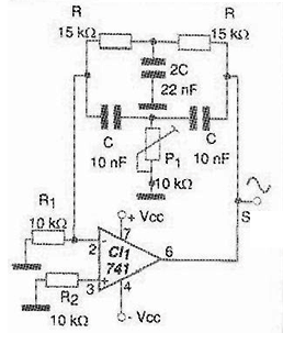La señal producida es senoidal de baja impedancia, lo que hace que este circuito ideal para proyectos de generadores de audio y otras aplicaciones en las que un tono puro de audio sea necesario. La fuente de alimentación debe ser simétrica y los amplificadores operacionales equivalentes al 741 pueden ser experimentados.