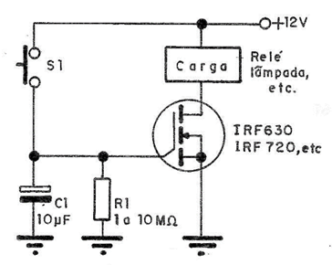 Luego, el capacitor se descarga a través de la resistencia, hasta que alcanzamos el punto donde el Fe I deja de conducir y la carga ya no recibe energía. En la figura tenemos el diagrama de esta aplicación de un FET de potencia. Utilizando una bombilla de 12V como carga y alimentando el circuito de 12V del coche, podemos utilizarlo como luz de cortesía temporizada.