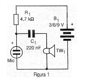 Tanto la polaridad de las pilas como del micrófono de electreto deben ser observadas. El resistor R1 es de 1/8 W o mayor y en realidad su valor debe ser obtenido experimentalmente en función de la tensión de alimentación, quedando típicamente entre 1k y 10 k ohms.