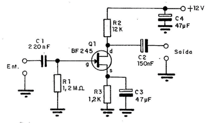 El primer circuito es un preamplificador de audio con excelente ganancia y muy alta impedancia de entrada. La alimentación se puede realizar con tensiones de 9 a 12V y el consumo es ligeramente superior a 0,5 mA. Con una batería de 9V y este consumo, este preamplificador puede funcionar durante meses seguidos. En la figura tenemos el circuito que presenta una ganancia de tensión de 10 veces.