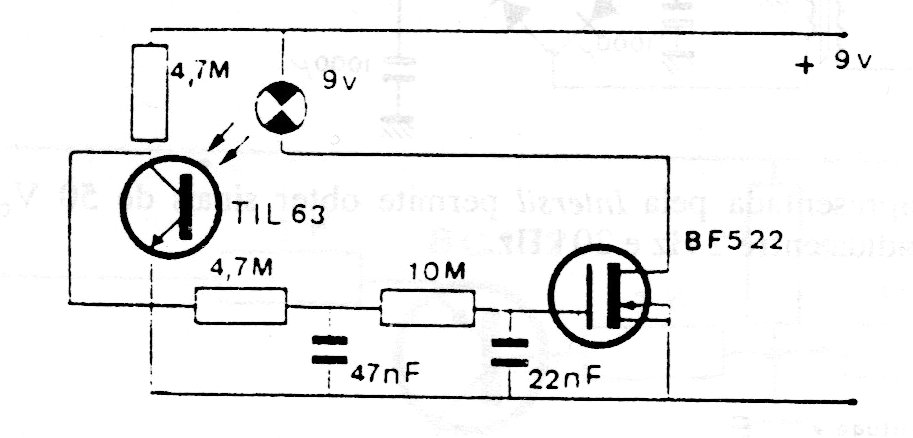 Este oscilador fue encontrado en un manual de circuitos europeo de los años 80. La configuración puede ser implementada con LED en lugar de lámpara y el fototransistor admite equivalente. La alimentación depende de la lámpara utilizada. El MOSFET puede ser cualquier tipo de potencia.