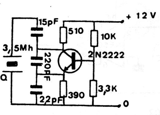 Este es un oscilador típico a cristal de cuarzo para la frecuencia de 3,5 MHz (rango de 80 metros) utilizado en radiotransmisores. El circuito es de una publicación antigua y los capacitores usados deben ser cerámicos.