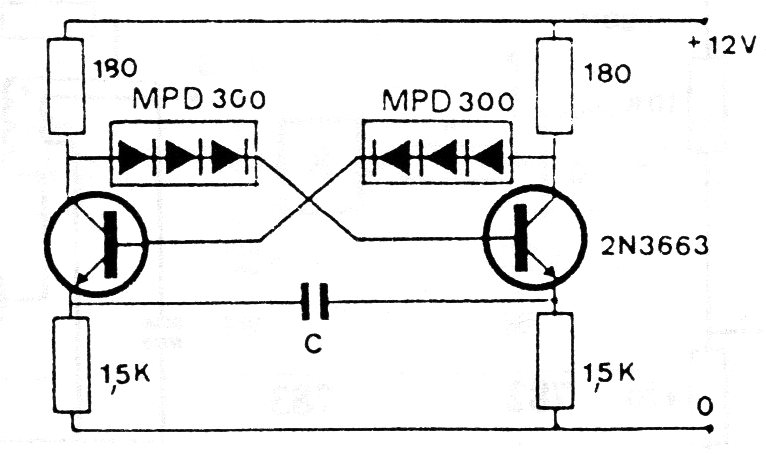Los transistores de este circuito de una documentación antigua pueden ser sustituidos por equivalentes como los BC548 y los diodos son de uso general como los 1N4148. El circuito funciona con 12 V y la frecuencia depende del capacitor; C. El límite de frecuencia está alrededor de algunos megahertz.