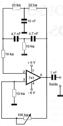 Los osciladores de doble T se pueden utilizar para producir señales senoidales en la banda de audio con buen rendimiento. El circuito presentado en la figura 1 es un ejemplo de oscilador de doble T para la banda de audio utilizando un amplificador operacional del tipo 741. Los componentes del doble T determinan la frecuencia de funcionamiento del oscilador mientras que el potenciómetro de 100 k ohms en el circuito de audio la referencia determina la simetría de la señal generada y por lo tanto su distorsión. Observe que la fuente de alimentación debe ser simétrica y que la salida se realiza por medio de un condensador de 1 uF. Dependiendo de la aplicación y del rango de frecuencias este capacitor puede ser cambiado o incluso eliminado.