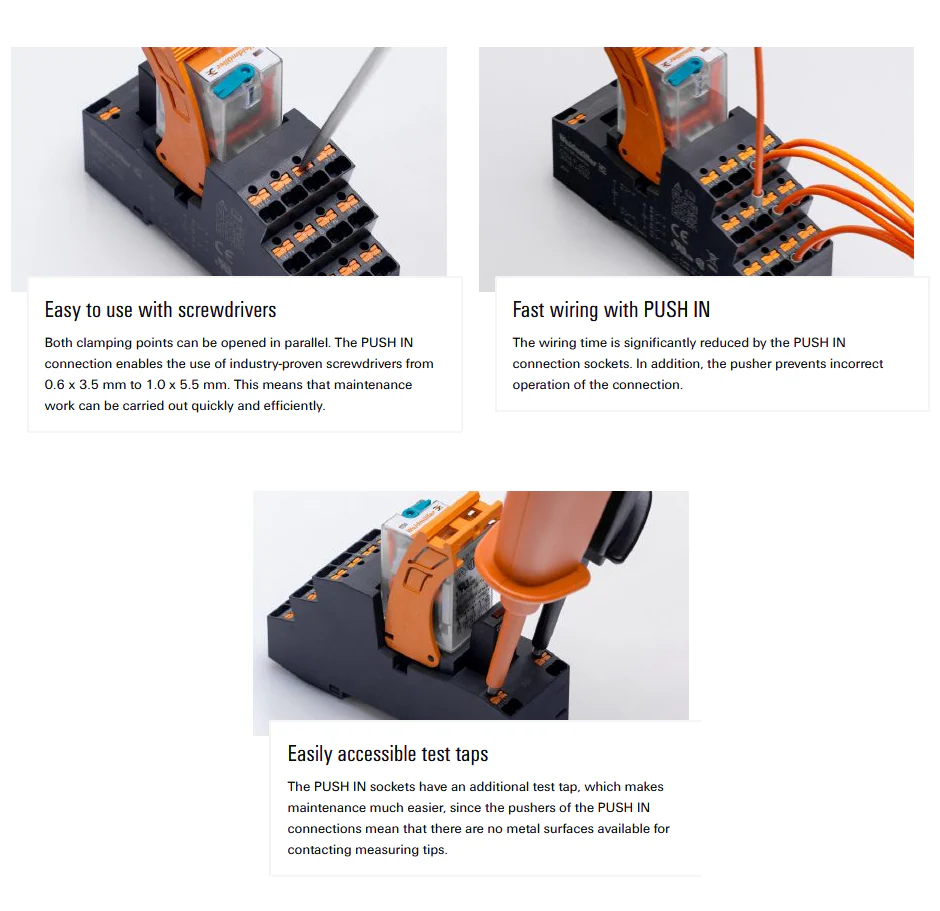 Los módulos de relé industriales Weidmuller CUBESERIES ofrecen opciones de conexión por inserción y por tornillo para una instalación rápida. Los módulos de relé CUBESERIES ofrecen durabilidad y un diseño robusto para conmutar cargas pequeñas, desacoplar sistemas y multiplicar señales de forma fiable. Estos módulos Weidmuller ofrecen versiones de contacto de relé a partir de 15,6 mm de ancho, con un contacto inversor de 16 A y dos contactos inversores de 8 A. Las versiones de contacto de relé a partir de 27 mm de ancho ofrecen dos contactos inversores de 12 A y cuatro contactos inversores de 7 A. Las bases de relé por inserción y por tornillo con diversas conexiones cruzadas permiten un cableado sencillo para su uso en aplicaciones de automatización industrial.
