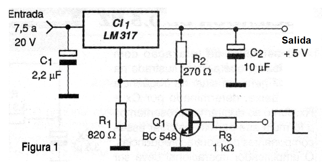 Con la señal presente en el nivel alto, la fuente tiene su salida cortada para una tensión del orden de 1,25 V. En el nivel bajo, la tensión sube a 5 V. La precisión de la tensión de salida depende de R1 y R2.
