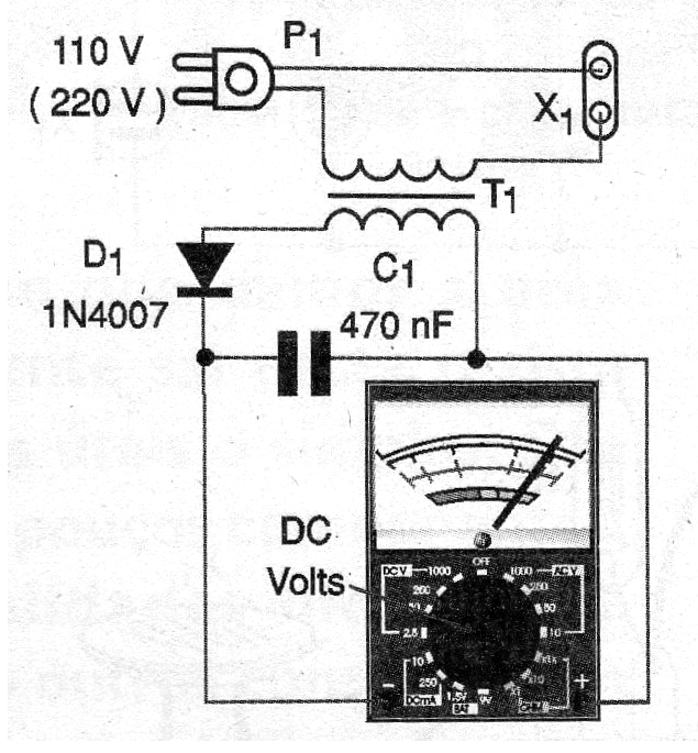 Observamos que el devanado primario estará conectado directamente a la red de energía, debiendo tomarse las precauciones adecuadas contra golpes. El voltímetro se utiliza en una escala de tensión continua alta, obtenida después de las pruebas de calibración.