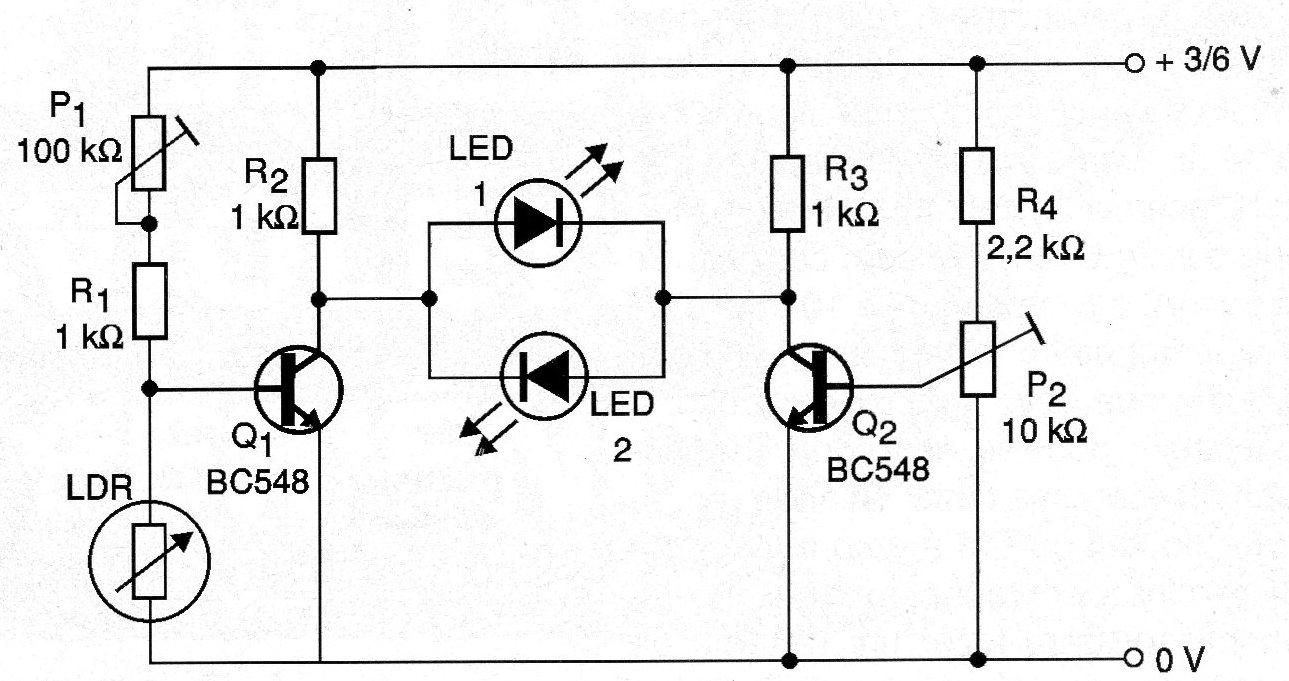 El circuito presentado en la figura 1 permite la comparación de niveles de luz basados ​​en una escala establecida en un potenciómetro.