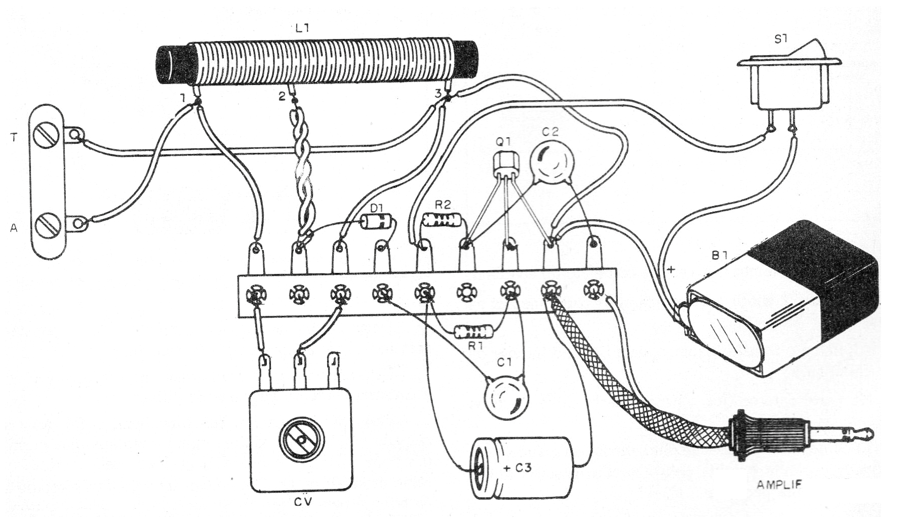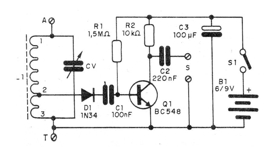 Con este sencillo circuito conectado a la entrada de un amplificador cualquiera, el amplificador se convierte en una radio de onda media de buena sensibilidad. El circuito es sencillo de montar y puede captar las estaciones locales con una pequeña antena,